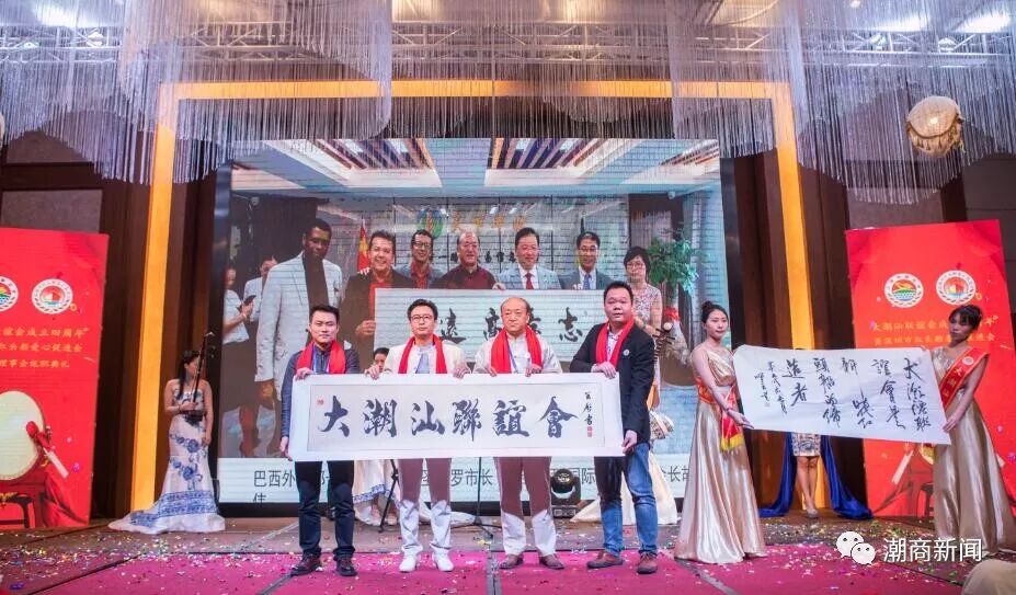 庆祝晚宴上,国礼书法家王启赠送墨宝“大潮汕联谊会”,祝贺两会第二届理事会诞生。
