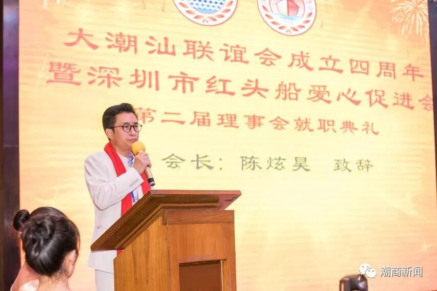 大潮汕联谊会.深圳市红头船爱心促进会会长陈炫昊先生发表了热情洋溢的就职讲话,陈会长首先代表大潮汕联谊会.深圳市红头船爱心促进会向出席会议的各位领导和嘉宾表示最热烈的欢迎和衷心地感谢,感谢各级领导多年来对本会的关心与支持,感谢社会各界人士对本会的信任和厚爱。